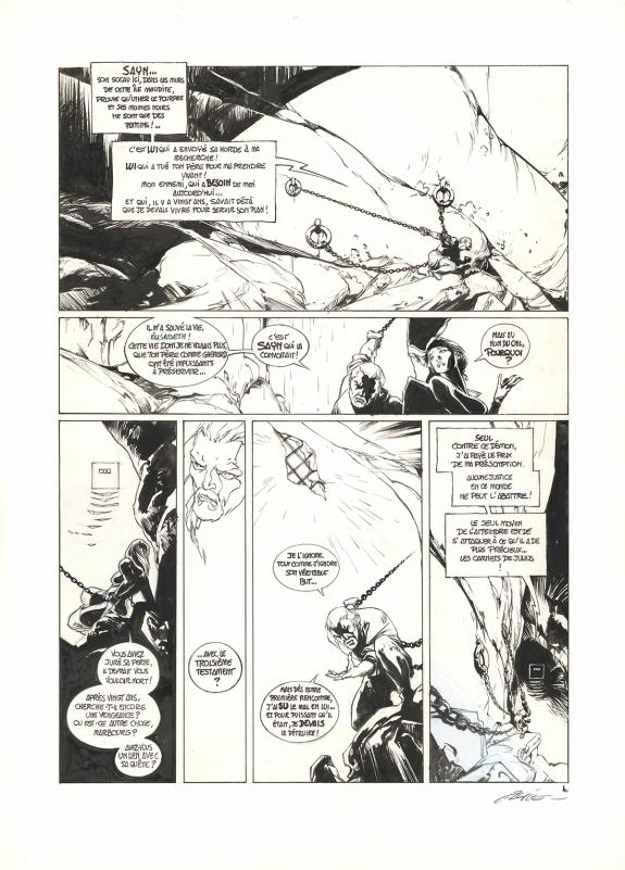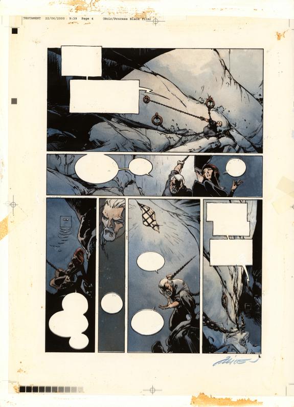 > Catalogue > Alex Alice > Le Troisième Testament > Luc ou le souffle du taureau > Planche originale n°4, rustines en case n°6, accompagnée de sa mise en couleur (aux encres acryliques)