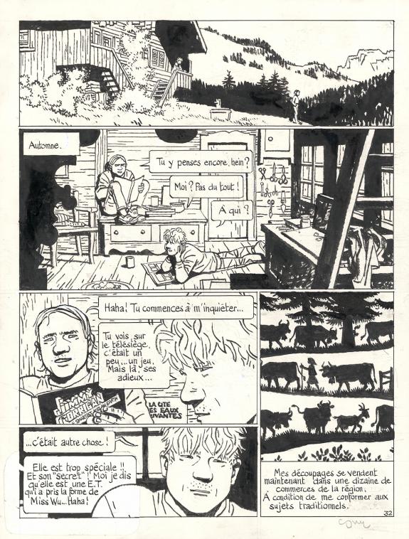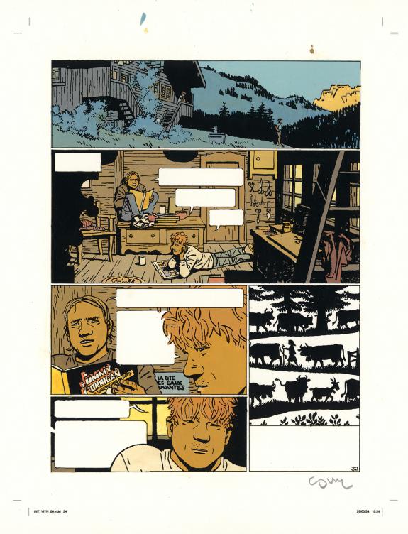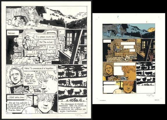 > Catalogue > Cosey > Album(s) sans série > Yiyun > Planche originale n°32 accompagnée de sa mise en couleurs, rustine collée en case n°4